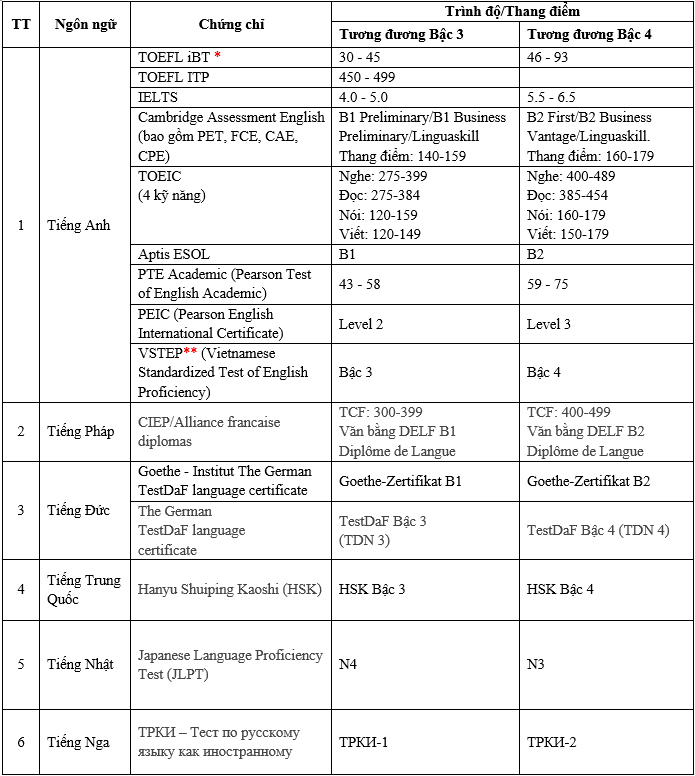 3. Bảng tham chiếu quy đổi một số văn bằng hoặc chứng chỉ ngoại ngữ tương đương Bậc 4 Khung năng lực ngoại ngữ 6 bậc dùng cho Việt Nam: