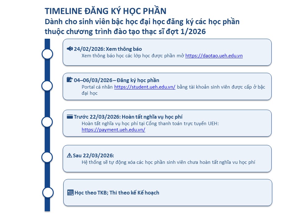 Đại học Kinh tế Thành phố Hồ Chí Minh (UEH) thông báo cho sinh viên đại học học các học phần cùng chương trình đào tạo thạc sĩ đợt 1/2025 như sau: